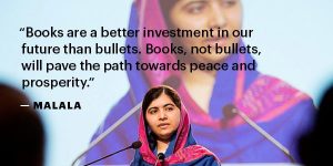 #Booksnobullets, questo il nome dell’ultima campagna lanciata ad Oslo durante il Forum per l’Istruzione e lo Sviluppo da Malala, in pri...